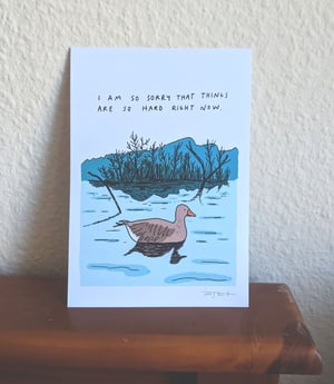 Spread some joy by giving this slightly overbearing waterfowl to a friend. Or hang it up in your room and feel his calming compassion.