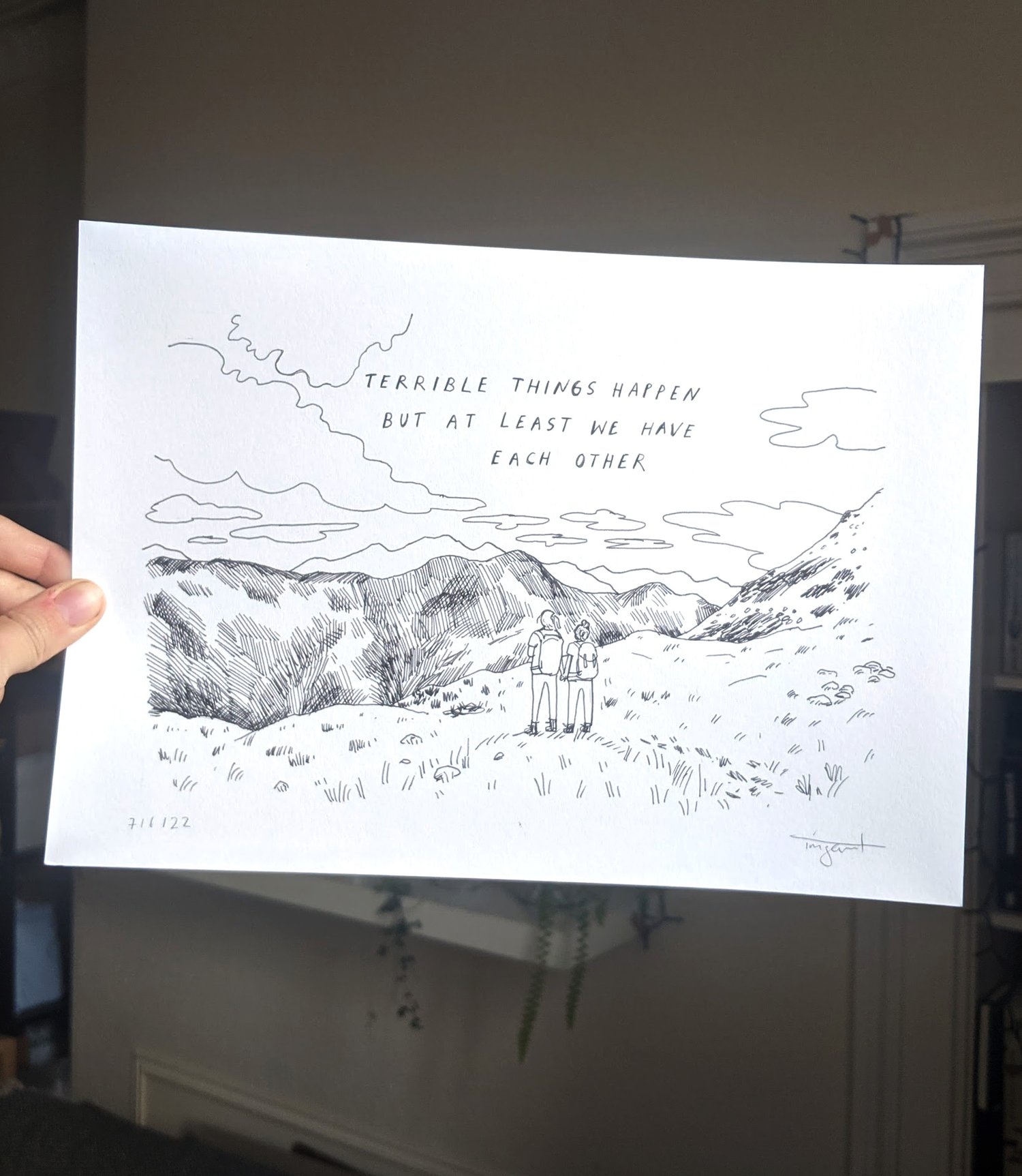 This comes from a comforting thought - the kind that makes you let out a breath you've been holding for too long. I turned that relief into this drawing.